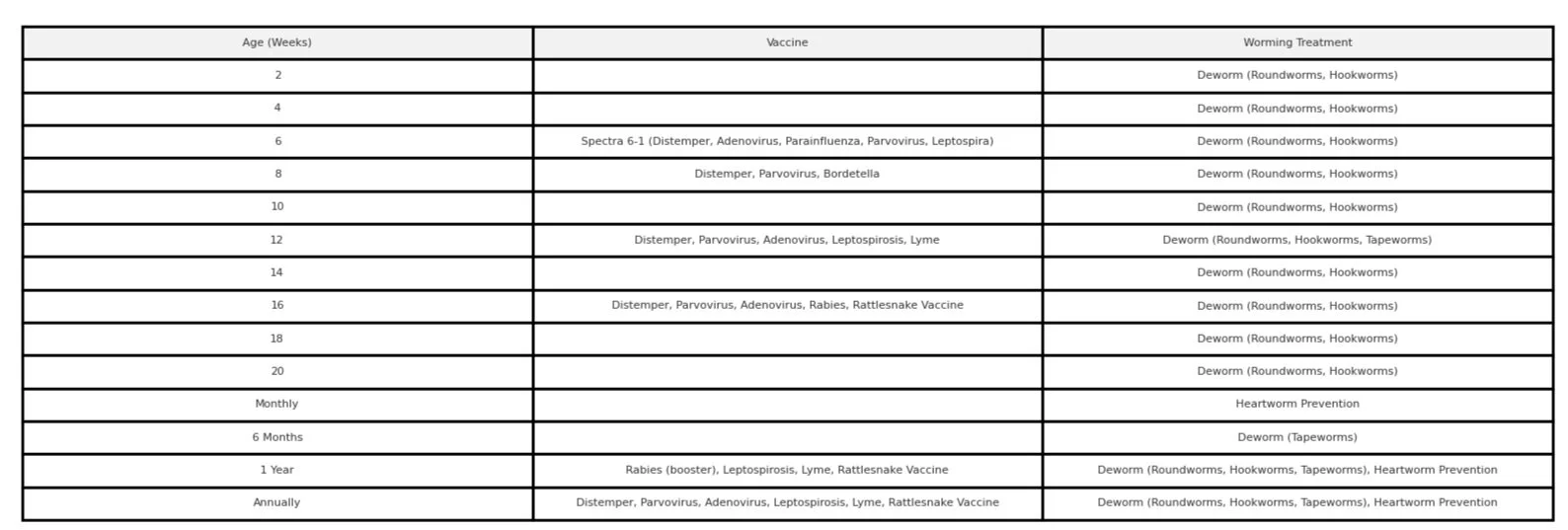 Worming Schedule: Heartworm prevention should begin at 12 weeks of age and continue monthly for life. Annual testing for heartworms is recommended.